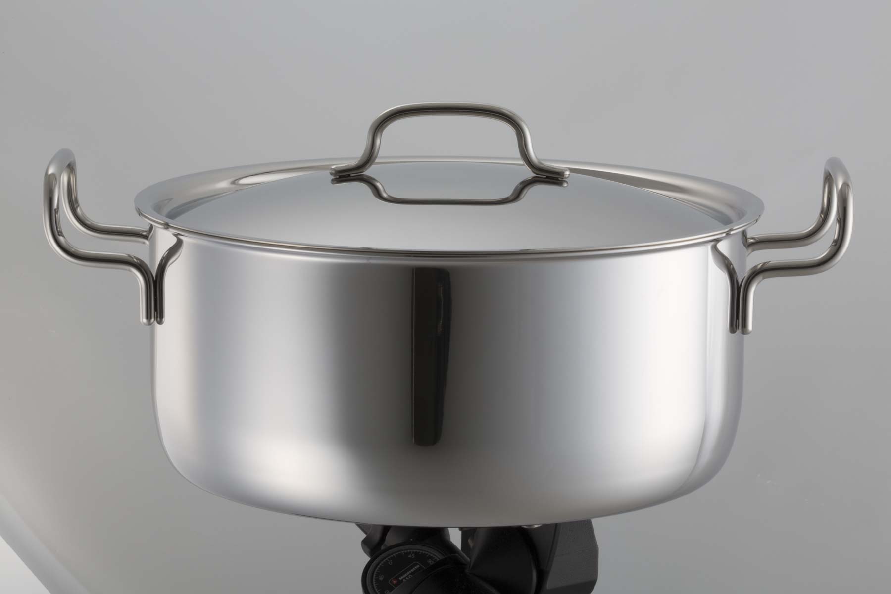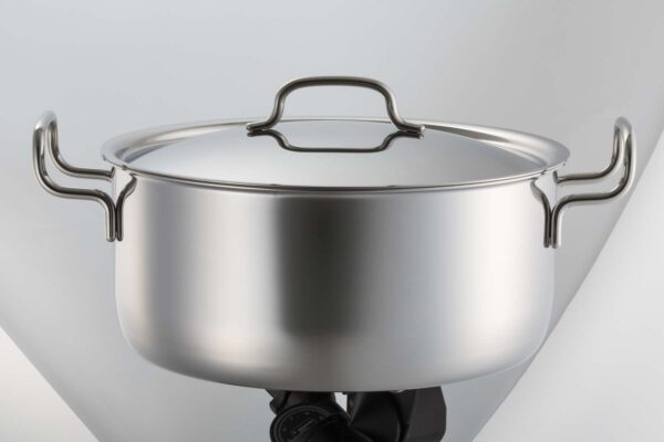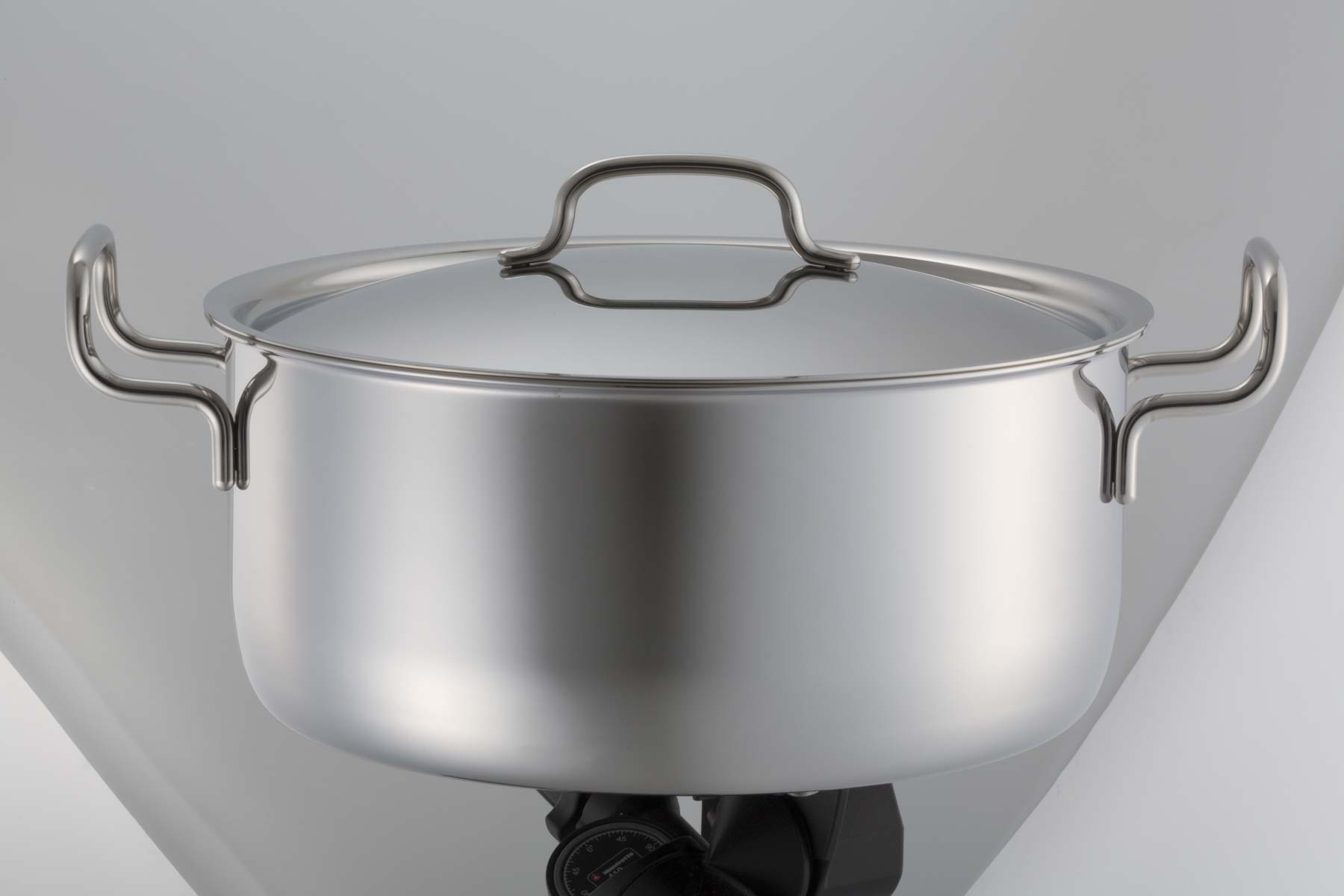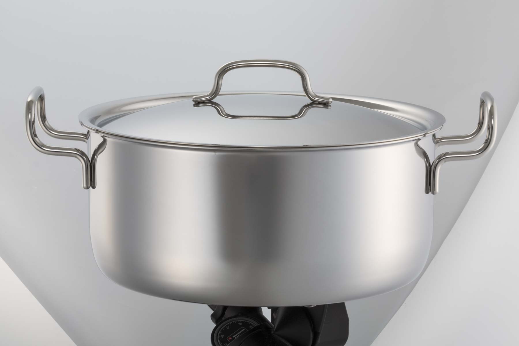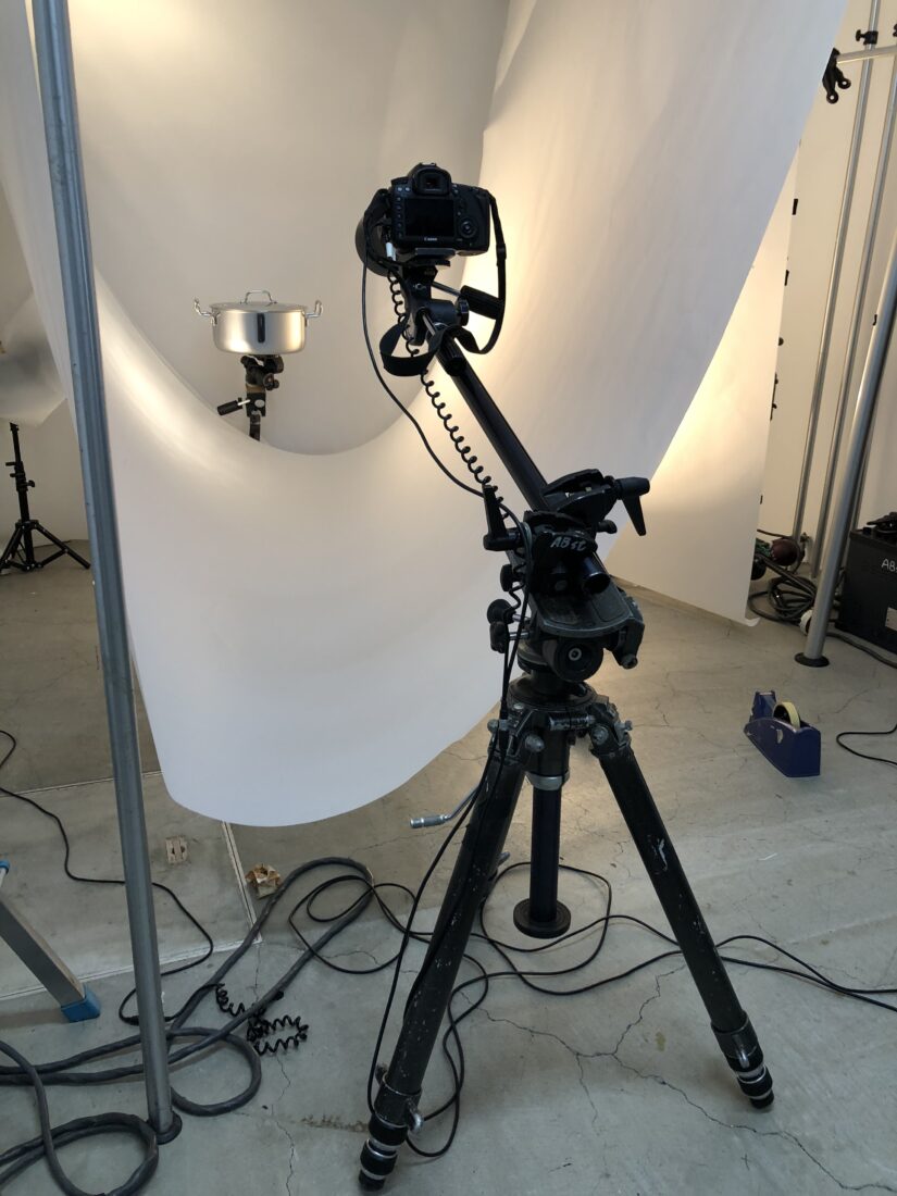 前回の撮影からライトは動かしていません。反射の角度が変わりますので微調整が必要です。カメラを下げるとどうしても正面が映るのでカメラが写ってしまい鍋の側面の真ん中が黒く影が写っています。商品撮影で特に反射するものは正面のカットが一番難しいです。