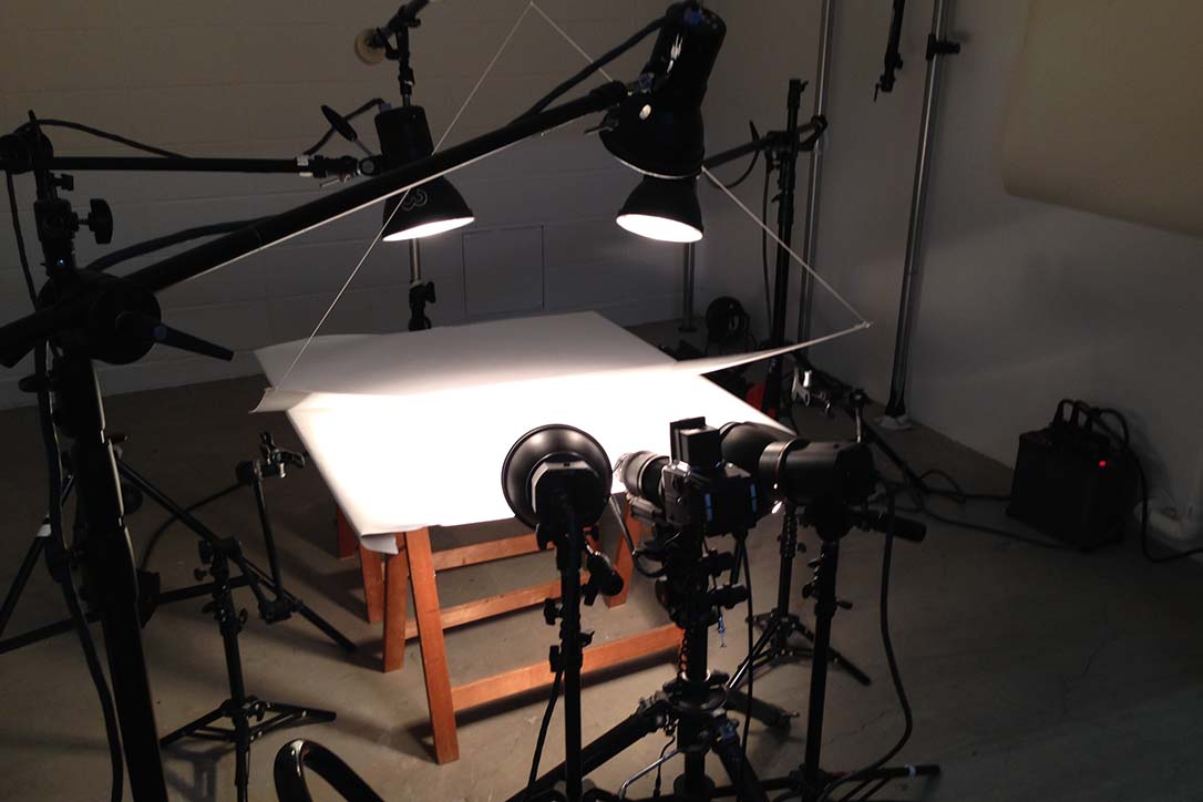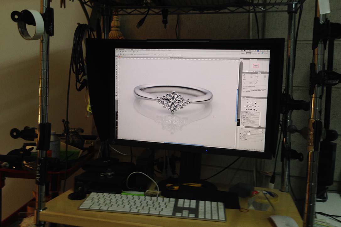 婚約指輪の撮影です。リングを寝かせて正面やや上からの撮影です。ダイヤのきらめきを出すのは基本的に正面からライトを入れます。でもそうすると直接ライトを当てているためにプラチナの地金に丸い反射が出来てしまいます。それを避けるためにライティングをかえて何枚も撮影して、後で合成して完成させます。