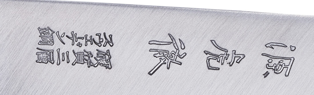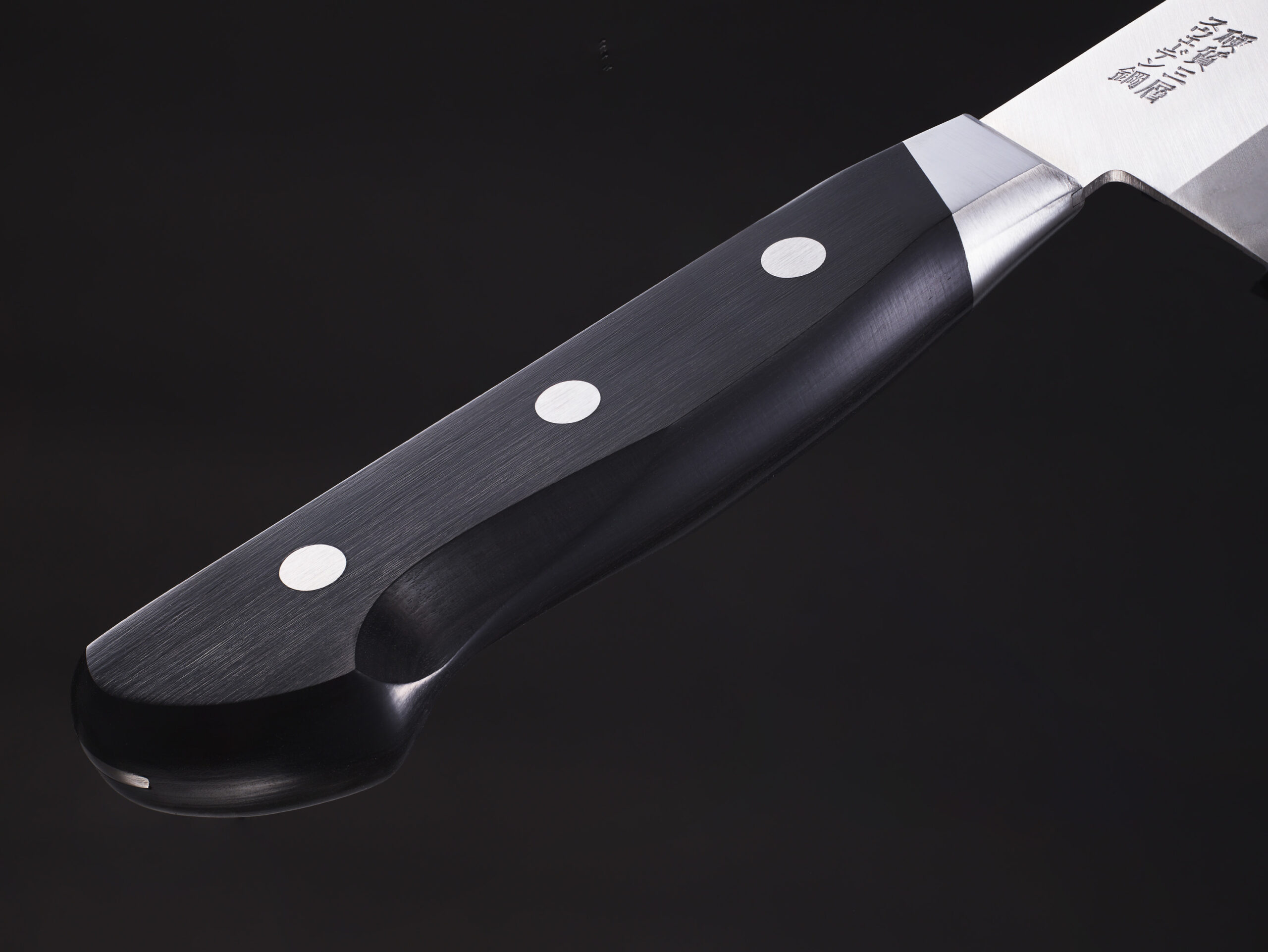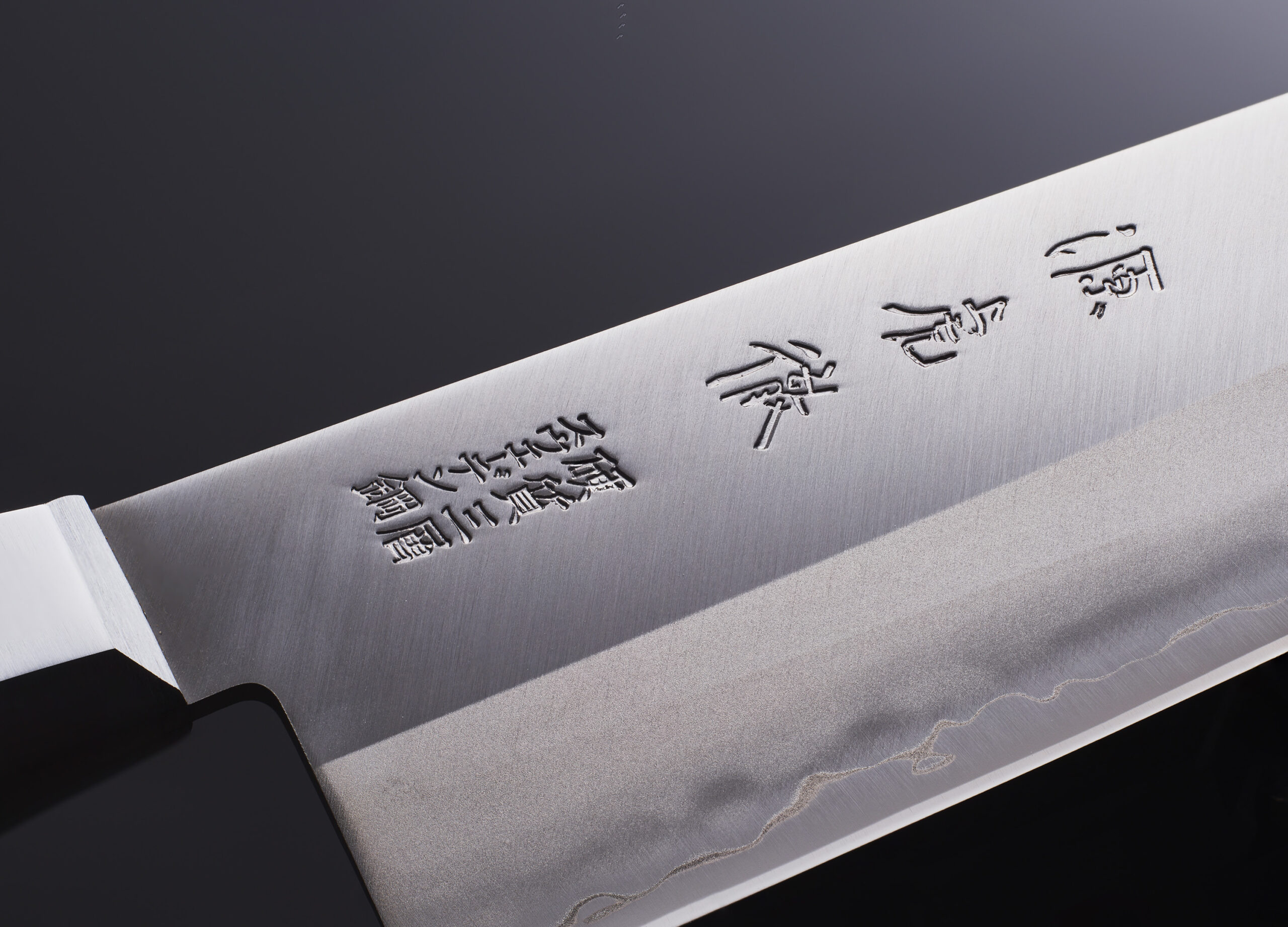 全体正面カット 銘とハンドル部分は斜めから立体感が出るように合計3カット撮影いたします。下記作例と上記作例を比べてください。銘もハンドルも斜めから撮影すると質感の出方立体感が向上します。背景は白 黒選ぶ事ができます。作例は黒背景にしました。