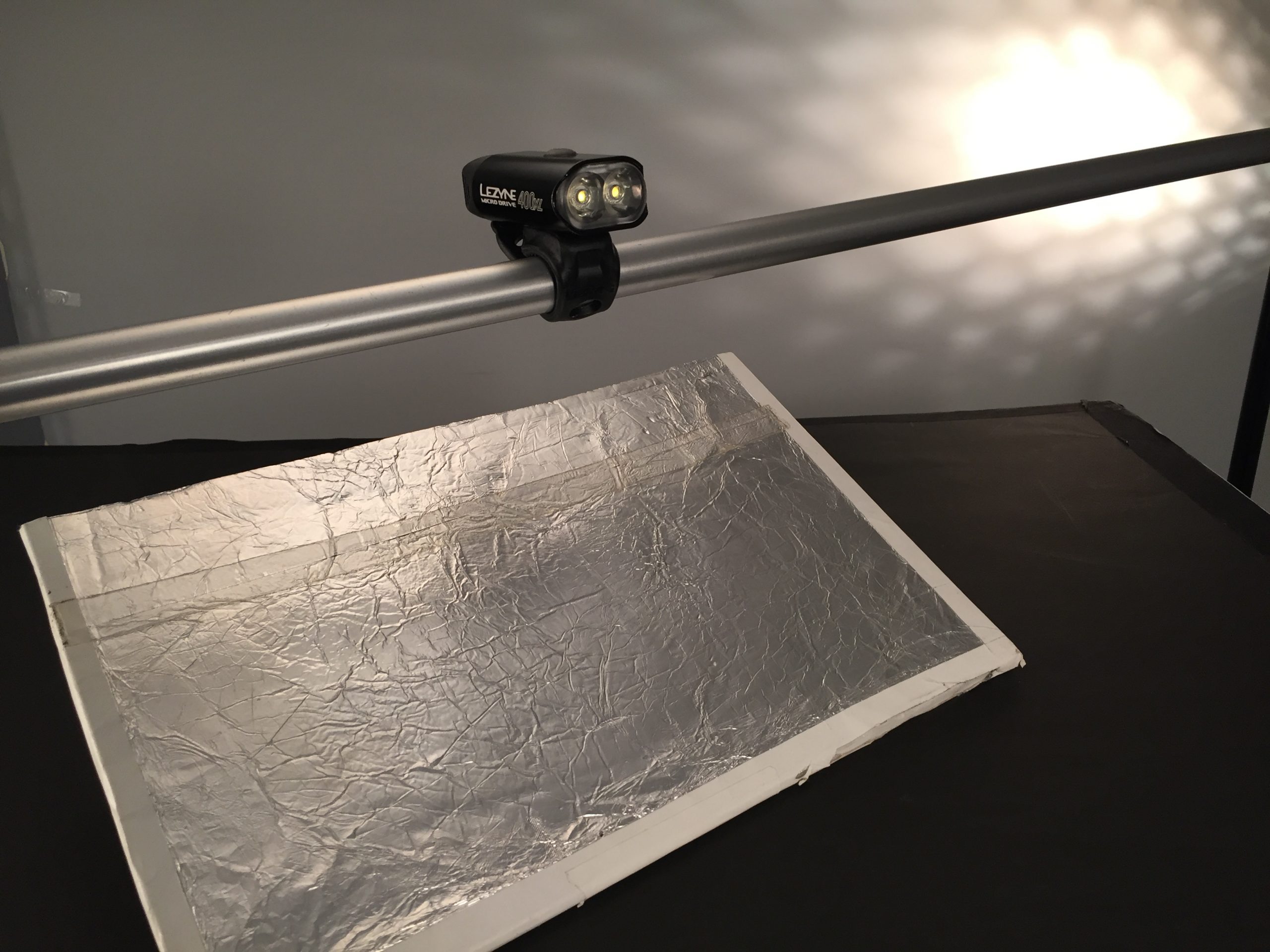 もう少しライトの発光部の反射をはっきりさせるために下から銀色のレフ版を入れてみましょう。