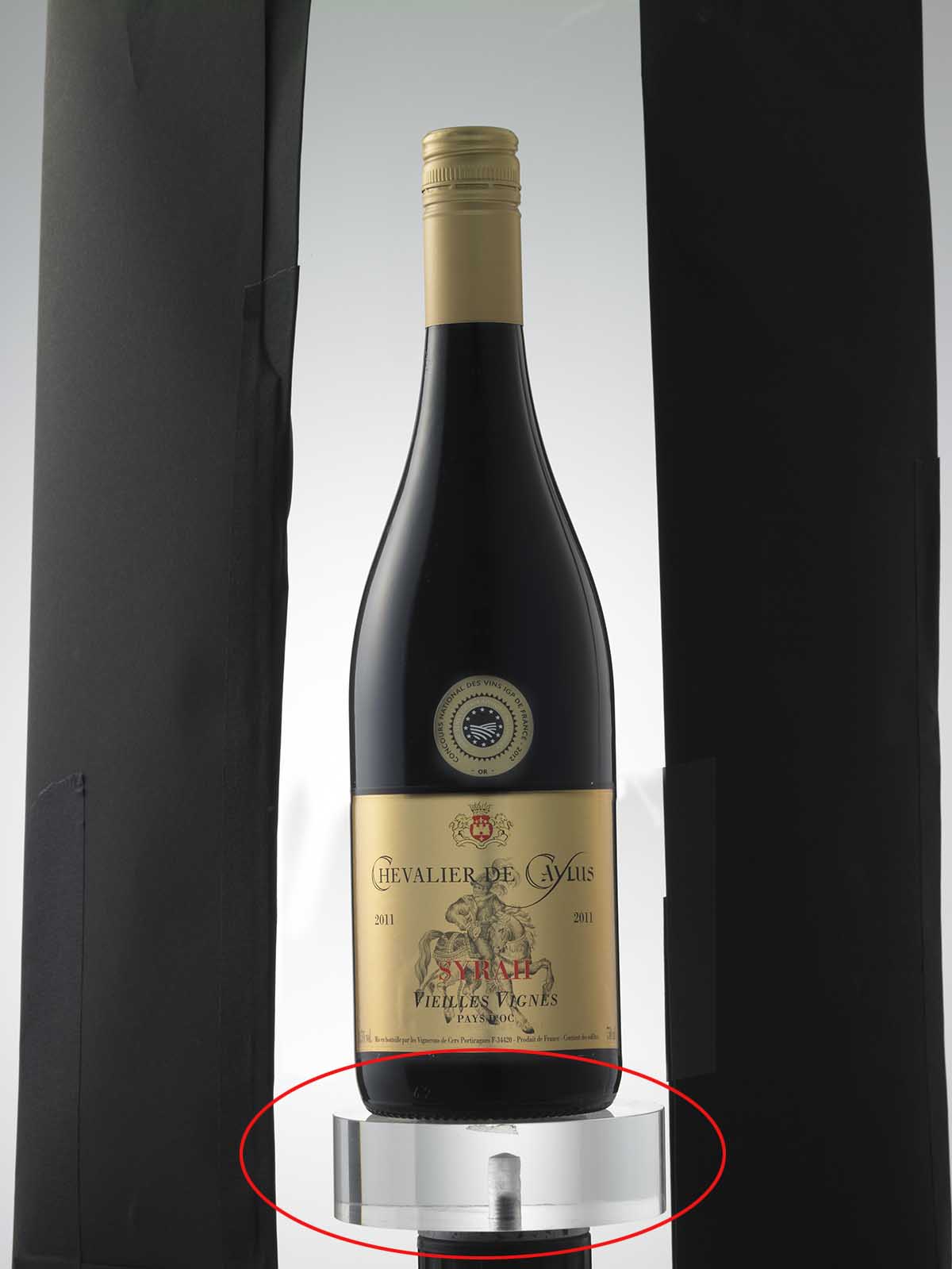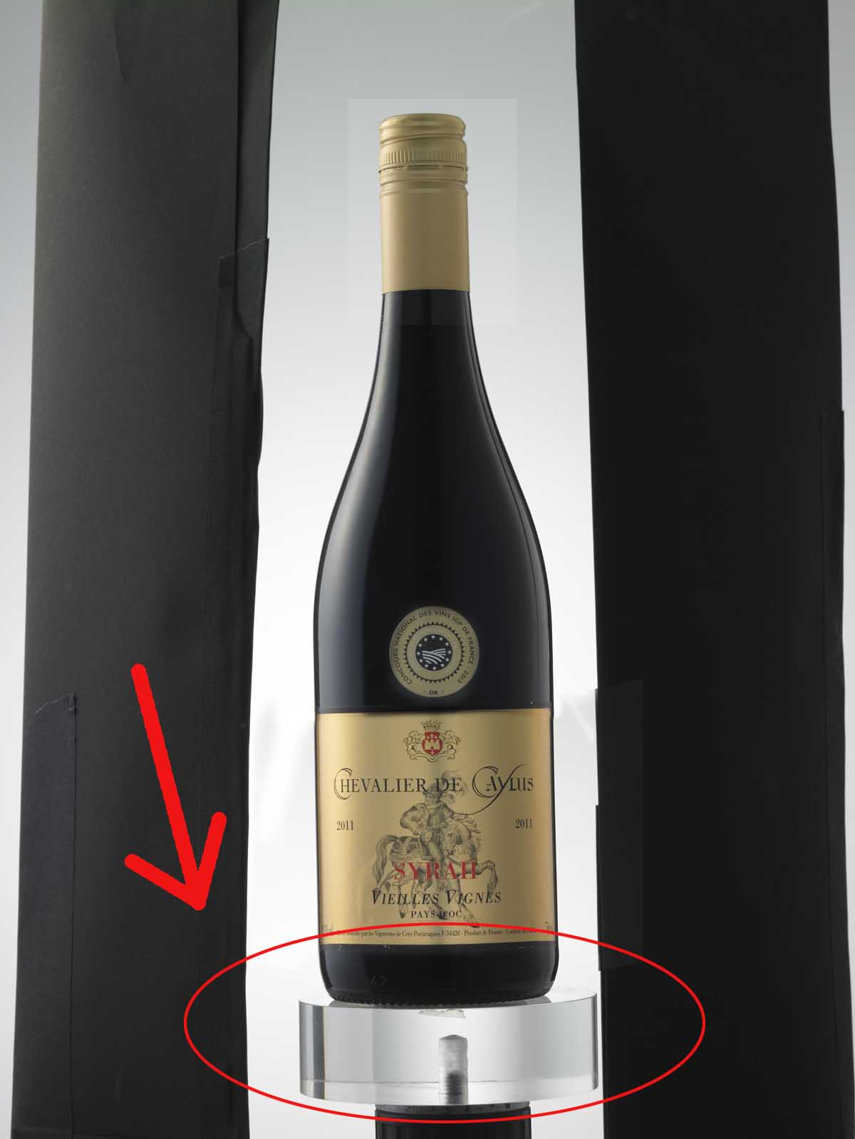 特にワインボトルなどの撮影のときには周りが写ってしまうために机の上に置いて撮影はしません。写真用のしっかりした三脚に大きさの合うアクリルをのせてその上にボトルを置きます。