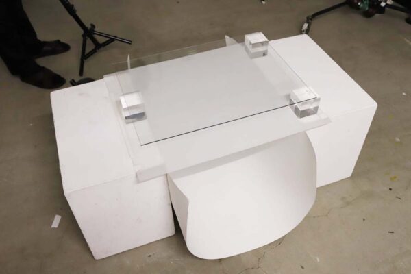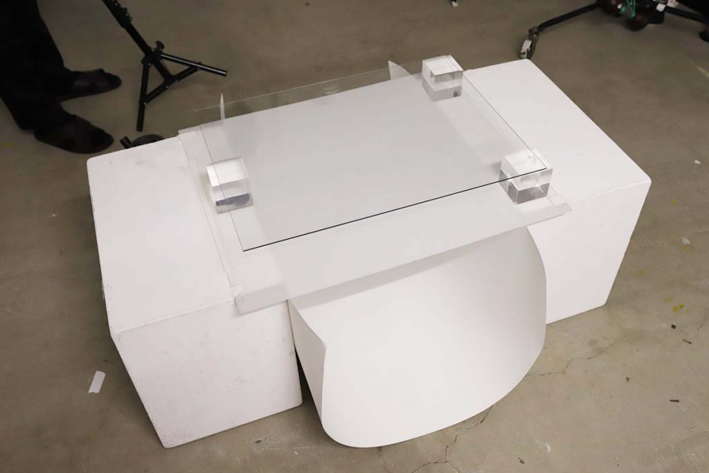 サイコロを2つ用意してその間に乳白のアクリル板を渡します。その上には5センチほど浮かせてガラスの板を置きサイコロの間からストロボを入れます。商品はガラスの上です。