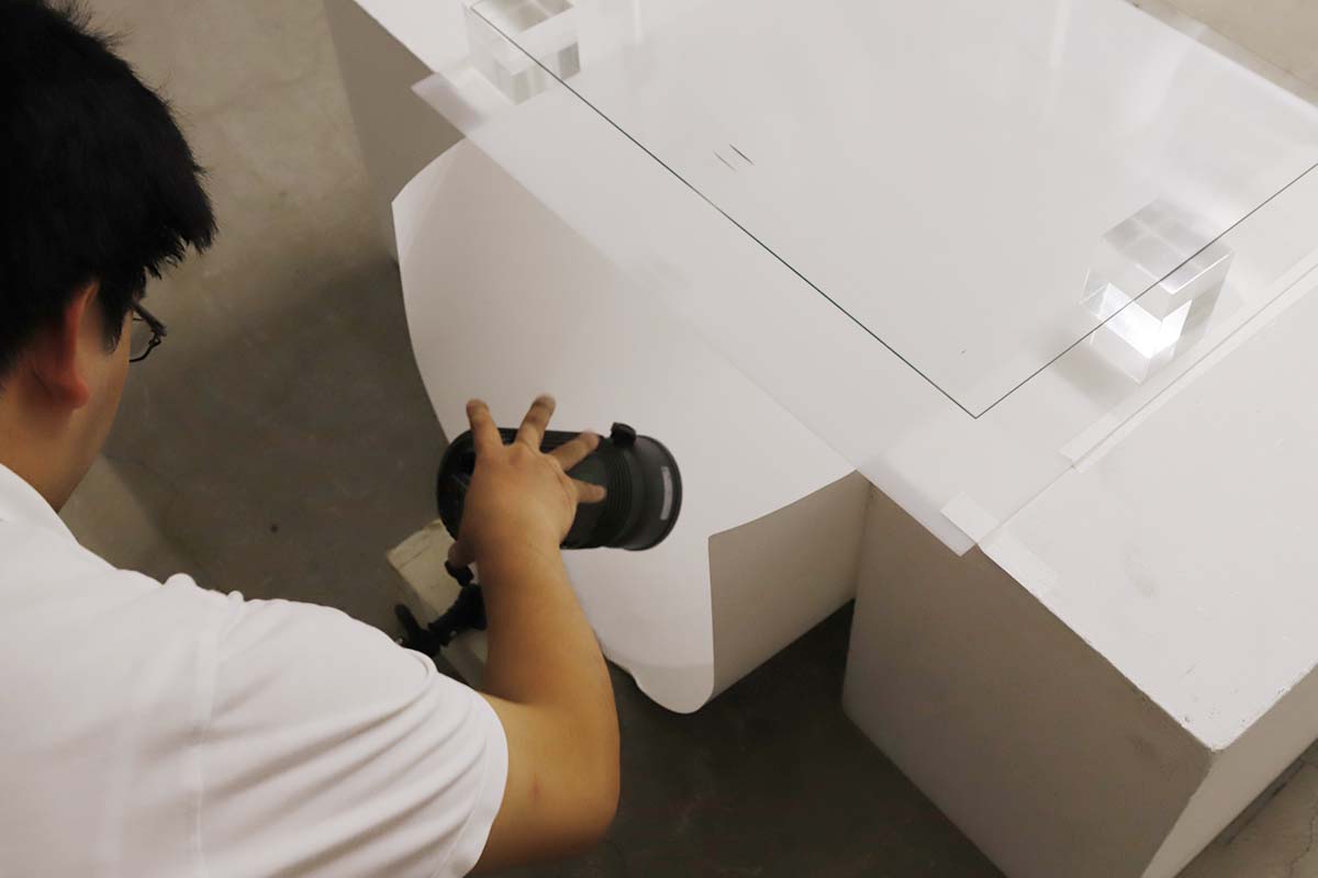 上からライトをいれましょう。まずは左からアトレー越しにライトを入れます。よけいな光を切るため回りを黒ケント紙で覆います。