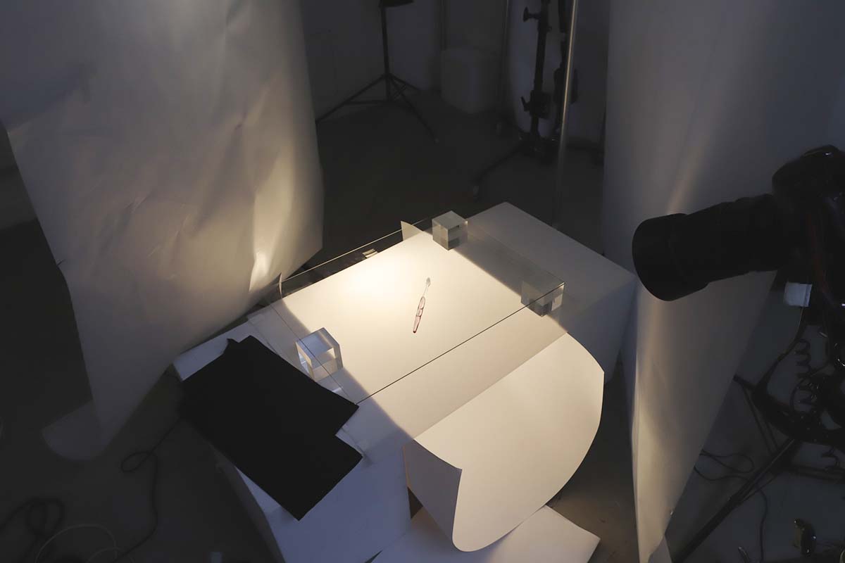 透明な物の撮影は反対側から光を入れて透過光で撮影します。