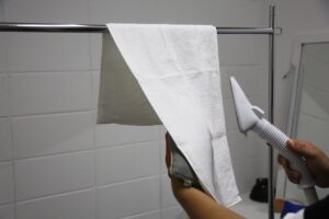 アイロンですとプレスすることになりタオルがつぶれてふんわり感がでなくなってしまいますのでスチームを掛けた方が良いです。
