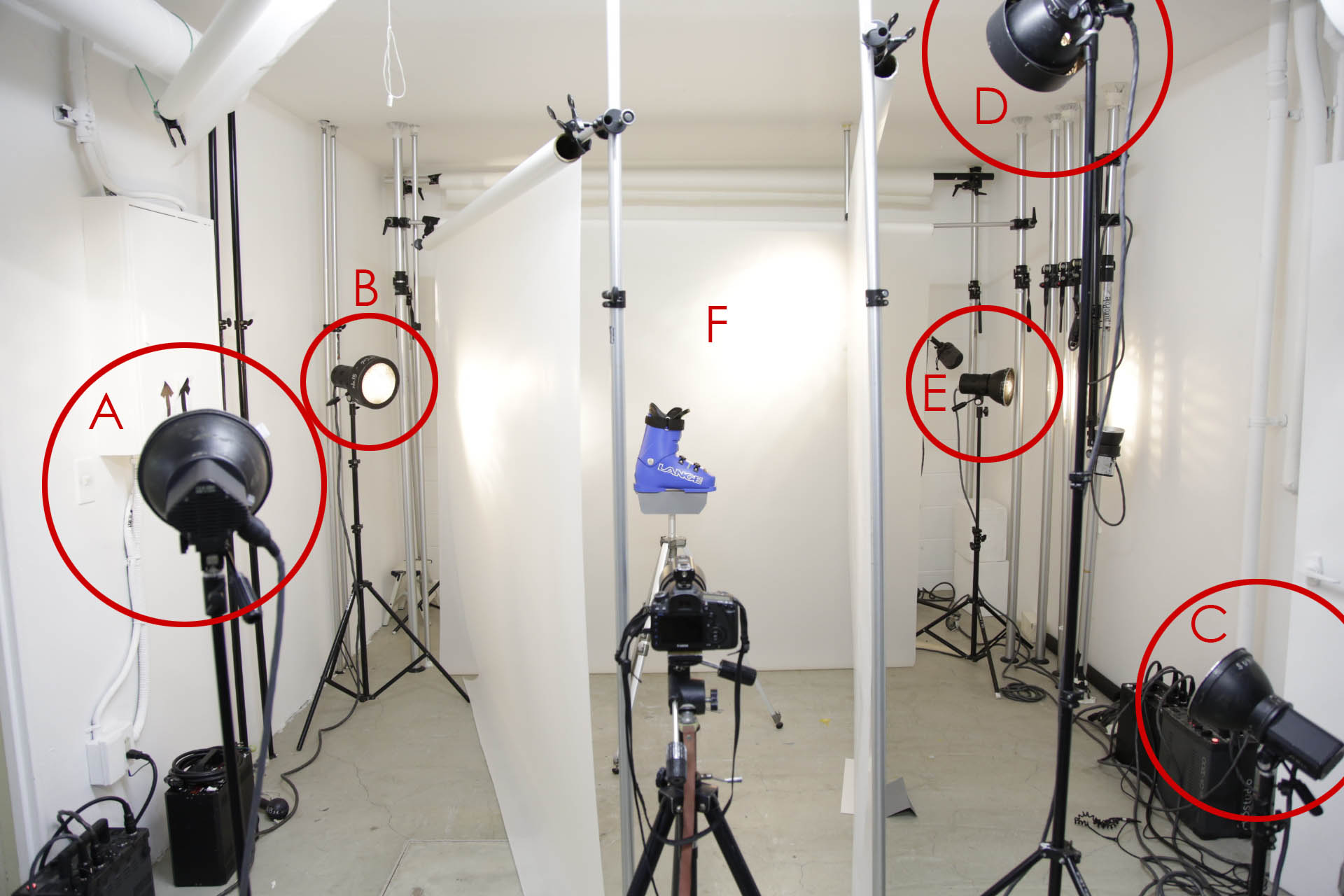 まずは左横からライトをあてます。横より少しブーツより後ろからです。Bのライトです。Aライトは壁に反射させて全体を明るくしています。ジェネはA B 同じところからとっています。