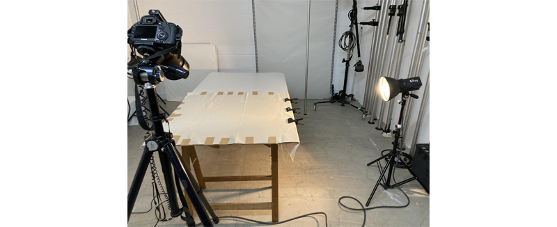 先日は(1/27のブログ)では光の硬軟を白い箱を置いて影の出方の変化で確認しました。今回は光の質とライトの当てる角度の違いをキャンパス生地を使って質感がどのように変化するか見てみましょう。 生地の設置 撮影台にキャンパス地を設置します。生地は... -